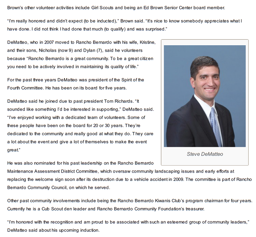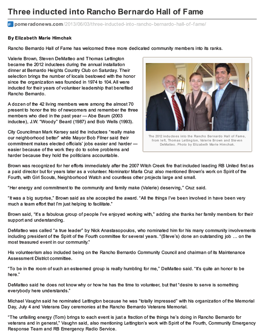 were honored at the Induction Gala Dinner on June 1, 2013 at the Bernardo Heights Country Club.